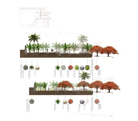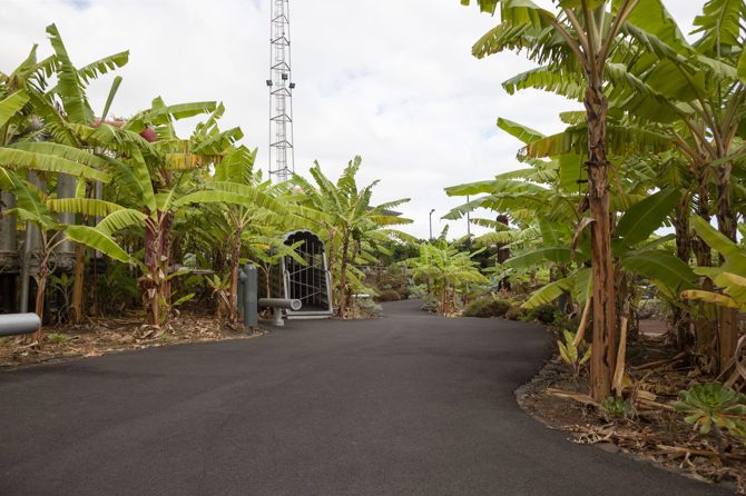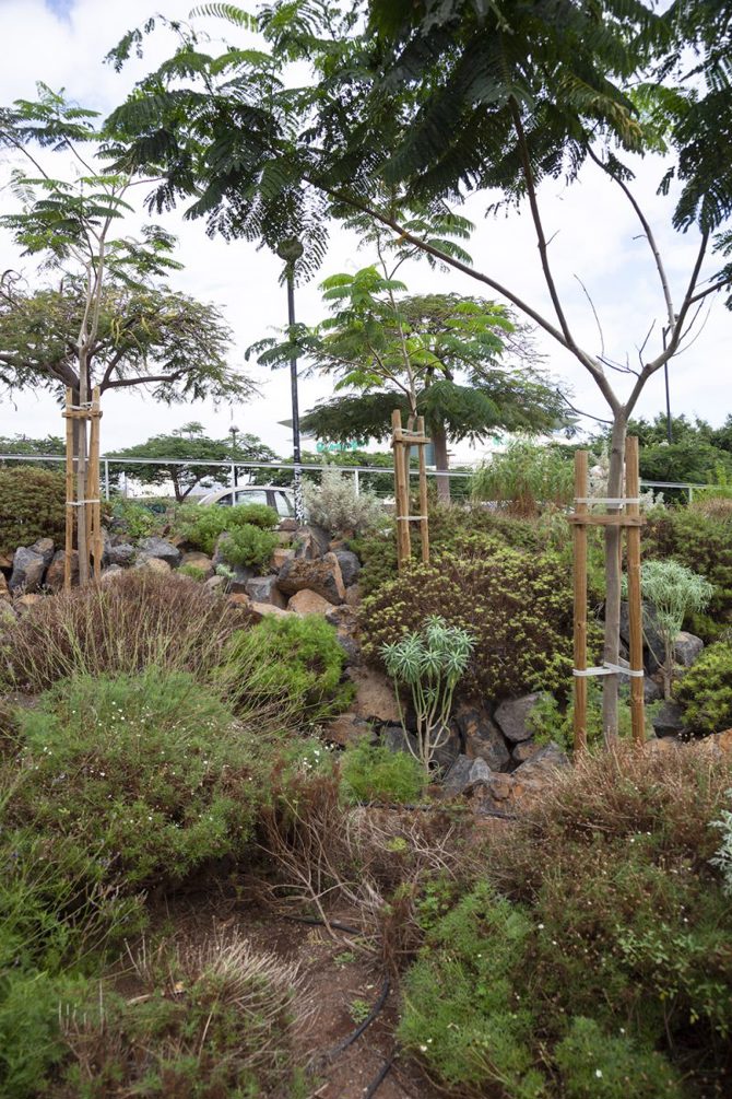 A medida que la exuberante vegetación subtropical coloniza la reliquia industrial, se va recuperando la memoria del pasado agrícola, construyendo un sentido de continuidad cultural y pertenencia. La disposición del nuevo jardín respeta la trama original del solar, así como el muro de piedra original, mientras que la base del depósito contiguo desmantelado se convierte ahora en el perímetro de la nueva plaza.