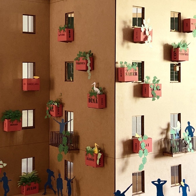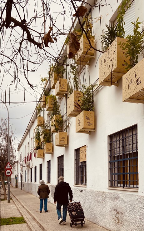 - Un “Jardín vertical” situado en la fachada del edificio de la calle Candelilla 6, sede social de la AES Candelaria, que reutiliza el agua de los aires acondicionados para cultivar especies aromáticas refrescando el ambiente por evapotranspiración. Una estrategia orientada a crear un paisaje exterior más fresco, diverso y habitable. No solo para los usuarios y residentes, sino también para otros vecinos y otras especies del barrio. Después de todo, como sostenía Louis I. Kahn, “la calle es una habitación por consenso. Una habitación comunitaria cuyas paredes aportan los que allí viven, entregadas a la ciudad para su uso colectivo”.
