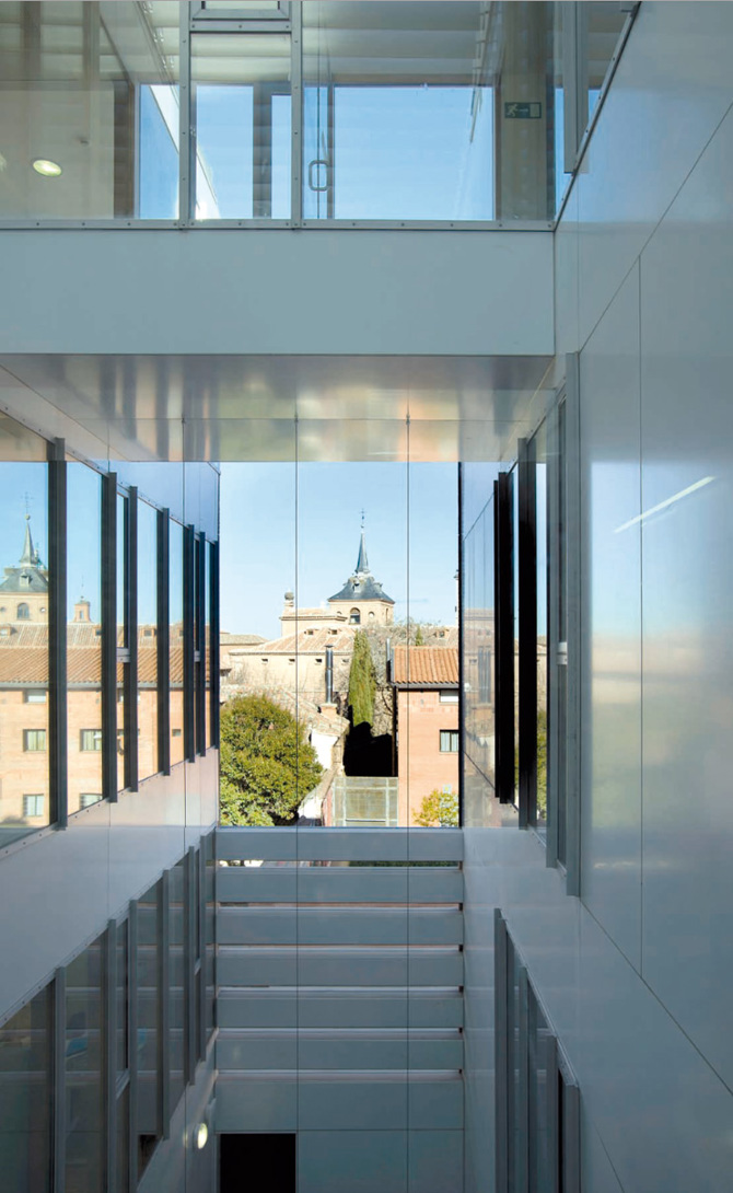 El edificio asume la restrictiva normativa en cuanto a las limitaciones volumétricas, materiales e incluso estéticas. Simultáneamente recoge en sus fachadas la realidad del entorno en que se ubica, con huecos repetitivos y ordenados en una de sus fachadas o una celosía de hormigón coloreado, con mayor opacidad en uno de sus extremos frente a la posibilidad de un edificio municipal adosado (nunca realizado); esta traslada a un segundo plano la superficie acristalada y ofrece una fachada institucional hacia la ciudad nueva. El diálogo con la ciudad se completa con el mirador, que ofrece vistas a las torres de Alcalá.