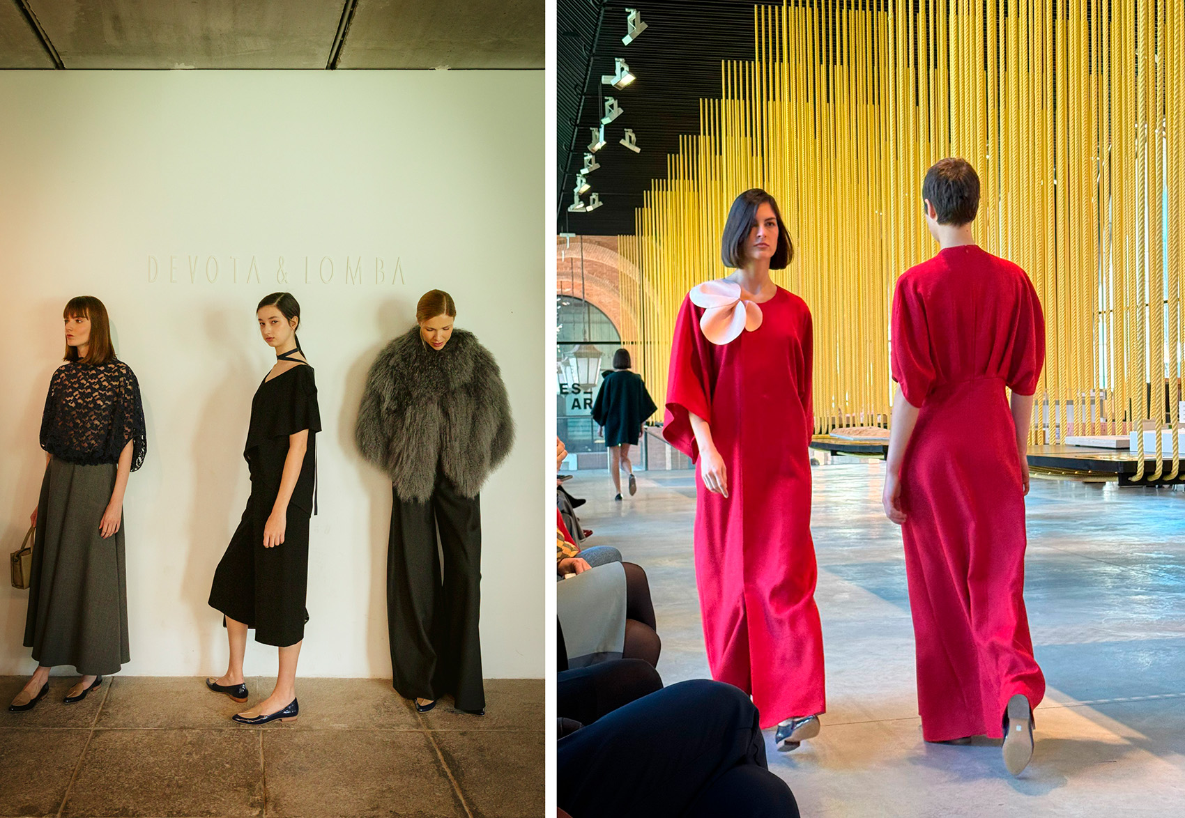 El desfile ha presentado la colección 79 de Devota & Lomba, una propuesta que explora las conexiones entre diseño, estructura y materialidad a través de un proceso creativo que establece paralelismos entre los lenguajes de la arquitectura y la moda. En este sentido, la colección propone analogías entre plano y patrón, maqueta y toile, edificio y vestido, explorando las posibilidades constructivas de los materiales y las formas. Vestidos y abrigos de carácter estructural configuran siluetas definidas por la búsqueda de volumen, textura y construcción.