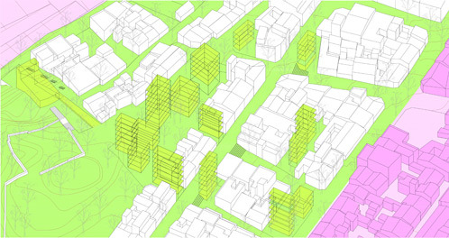 Esta transformación se apoya en el reciclaje del tejido residencial; se aprovechan los solares existentes o las numerosas casas deshabitadas, en venta en la actualidad para implantar una tipología de pequeños bloques-torre. Funcionan como infraestructura urbana ya que sus espacios colectivos de relación y sus escaleras actúan como calles a pequeña escala. Conexiones que, en el ámbito de lo privado, en relación a la vivienda, permiten una ampliación en horizontal y vertical que facilita su hibridación con otros usos.
