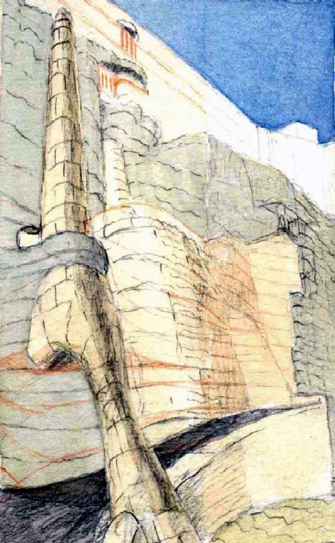 Refuerzo, como arbotante con pináculo, que da apoyo a la chimenea de ventilación de la cámara aerobia de la depuradora de aguas residuales. Croquis a lápiz y acuarela - Javier Vellés -