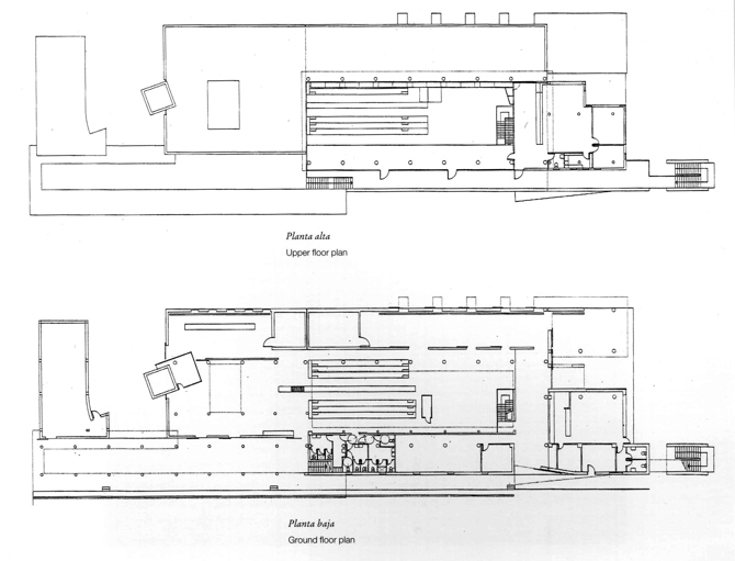 Estructura de hormigón armado, con zócalo visto de buena dimensión, Revestido exteriormente de piedra caliza gris; estructura de cubierta de madera laminada, en forma de bóveda rebajada y cubierta en lámina de cobre. Resto de cubiertas planas.