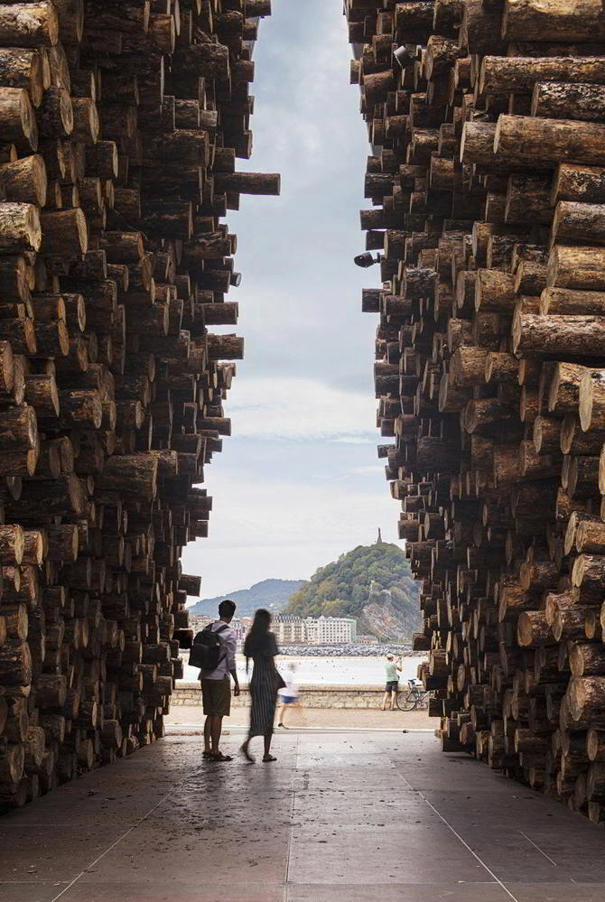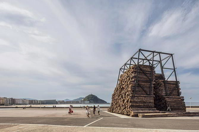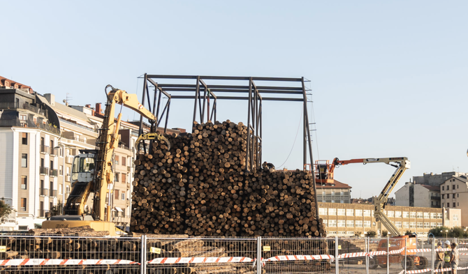 Para la construcción del pabellón se emplearon cerca de 1.000 estéreos (unidad de medida forestal equivalente al m3) de troncos de pino laricio provenientes de Puente la Reina, una de las localidades de Navarra afectadas donde ardieron más de 15.000 hectáreas en verano de 2022. Maderas Larreta, empresa local encargada del aprovechamiento de esta zona, colaboró en la construcción del pabellón con el préstamo del material, su transporte hasta la zona y la maquinaria y personal necesarios para su descarga. Se estableció un diálogo entre el apilamiento masivo de troncos y una estructura de acero capaz de contener y soportar la descarga rápida del material.