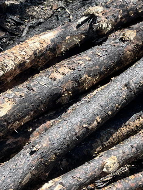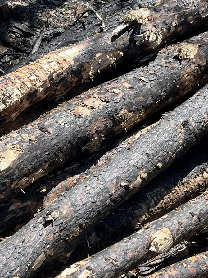 En lugar de construir el pabellón con un material ¨reclamado¨ o un producto industrial procesado, los troncos con los que se construyó el pabellón fueron trasladados directamente de las zonas de aprovechamiento de bosque quemado. Exhibir un material proveniente de una catástrofe natural subraya la urgencia de conectar a las personas con las consecuencias tangibles de la crisis ambiental. Este enfoque no solo pone en primer plano un recurso desechado o descartado, sino que lo recontextualiza, otorgándole una segunda vida en un entorno urbano en el que abunda el consumo y el desecho.