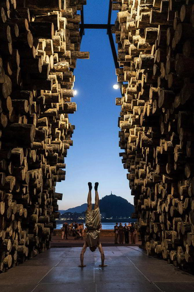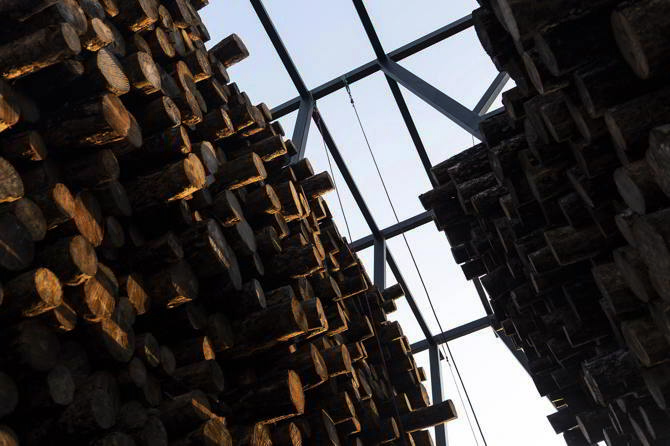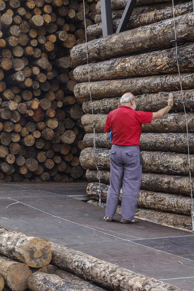 La disposición de los troncos generaba un volumen piramidal atravesado por una grieta central que orientaba la mirada hacia el paisaje. Del espacio se desprendía ceniza y cortezas que contaminaban la plaza, invitando a los visitantes a oler y tocar la madera quemada.