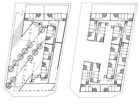 Una línea de alta tensión obligó a definir una zona de protección paralela a una de las calles y desplazó el volumen construido, de manera que a partir de esta restricción se organizó un generoso espacio semipúblico que se trató como antesala de los dos importantes accesos verticales a las viviendas. Su proximidad y abertura a la calle y su relación visual con una gran avenida que tenía enfrente le dieron una mayor amplitud y una mejor conexión con la ciudad.
