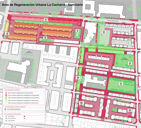 Para el desarrollo de los trabajos se identifican los ámbitos de la ciudad con mayor índice de vulnerabilidad, centrando así la intervención en los barrios de La Cacharra y Seminario. Se trata de un área residencial construida en los años 50 del siglo XX y que, tras más de 60 años y un proceso de abandono y envejecimiento de sus infraestructuras y construcciones, se enfrenta además a las consecuencias de los fuertes cambios en sus dinámicas económicas y en su estructura demográfica.