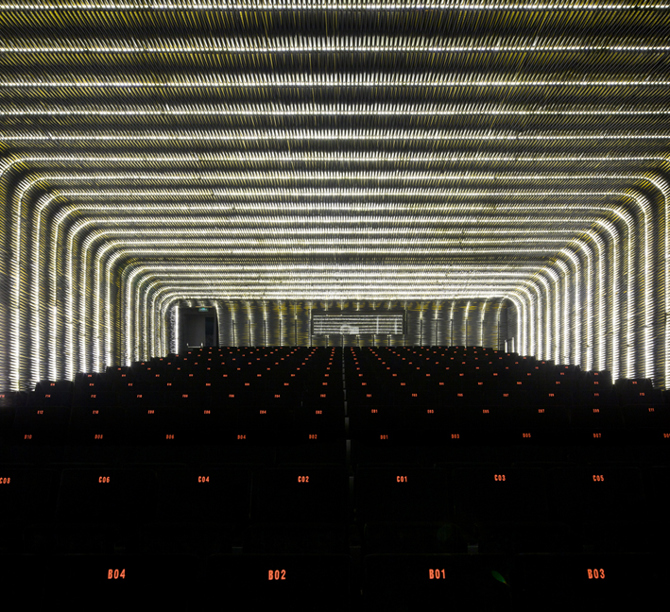 En la transformación del antiguo matadero en un nuevo espacio destinado al cine, lo antiguo y lo nuevo conviven en una atmósfera sombría común en la que la luz artificial de luminarias y proyecciones se convierte en el elemento fundamental del proyecto. La nueva naturaleza del centro cinematográfico lo convierte en un lugar necesariamente oscuro en el que la luz artificial, más allá de ser un medio de iluminación, es un mecanismo de información y creación atmosférica.