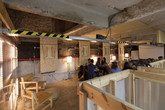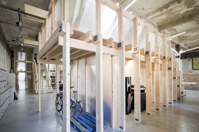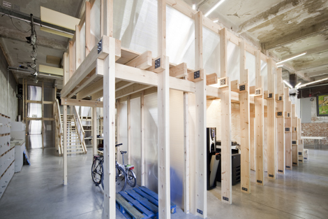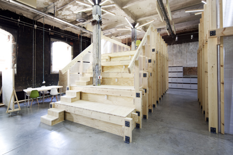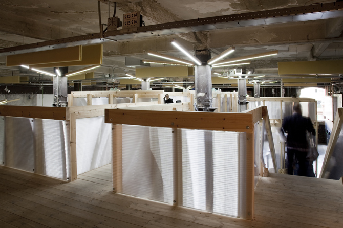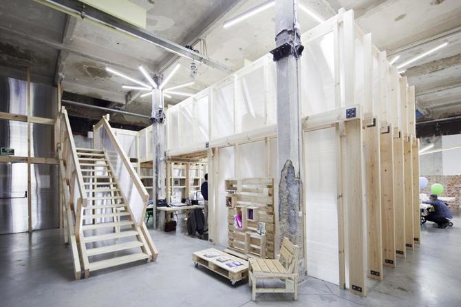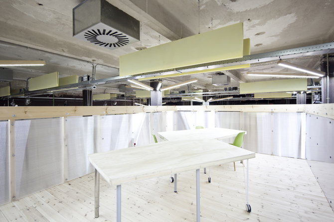 Tres volúmenes cercanos a la entrada organizan el espacio, comprimiendo y plegando las circulaciones a su alrededor. Esto crea un gradiente desde lo compacto a lo expansivo, de lo agitado a lo tranquilo, que permite proporcionar una cierta variedad, adaptabilidad y flexibilidad a los ambientes de trabajo. En poco más de un mes se construyó un proyecto reversible, “envasado al vacío” en su precisión, adaptable a las distintas necesidades del cliente, por una cantidad inferior a los 105 euros por metro cuadrado, que permitió que el proyecto acabase llevándose a cabo.