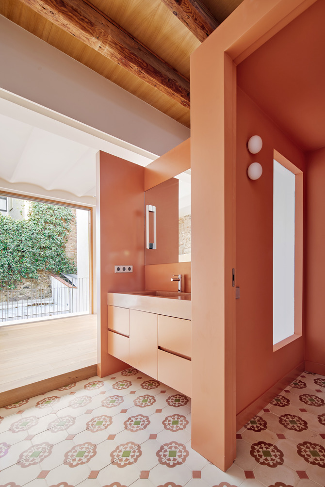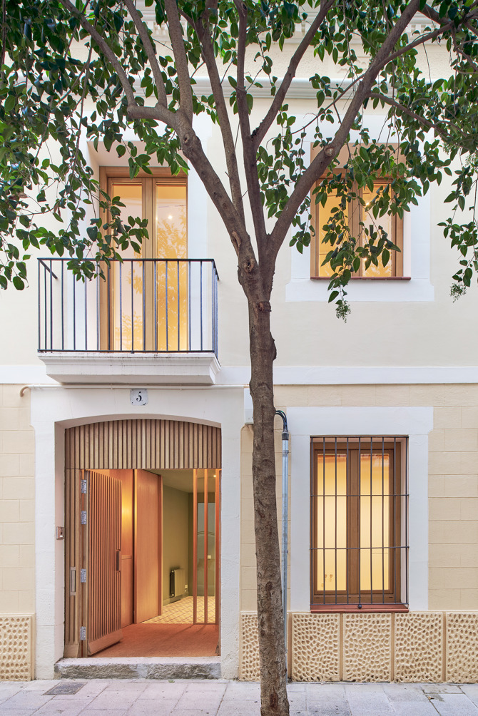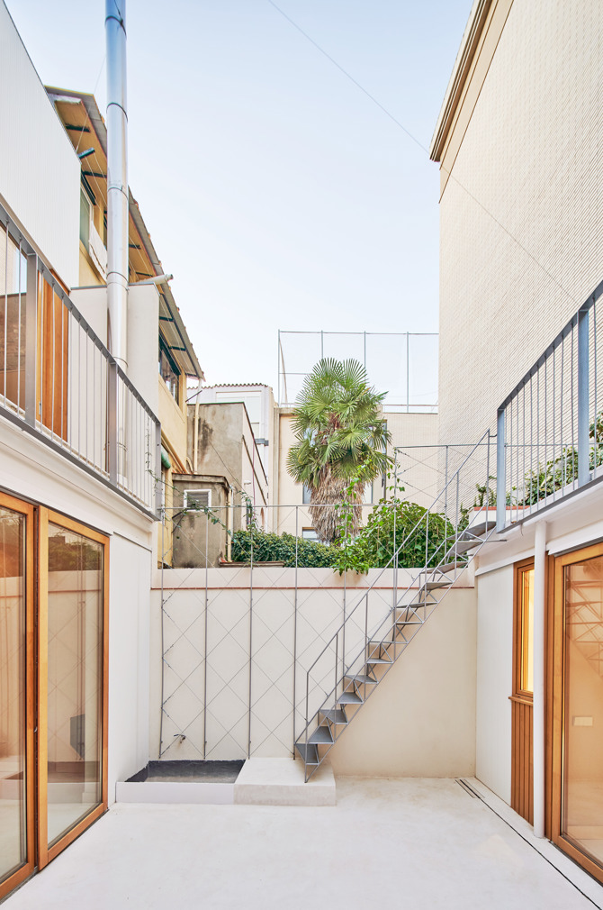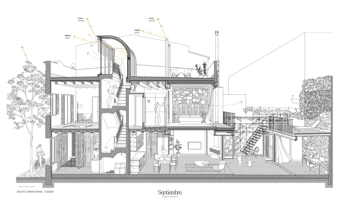 Septiembre Arquitectura se alimenta de esta riqueza original y la adapta a las nuevas necesidades y usos. Potenciando la superposición de estilos, que permite conservar la historia, el espíritu de la vivienda y alguno de sus detalles constructivos y transformarla en una nueva realidad. El trabajo es un ir y venir entre las nuevas necesidades de la vivienda y la recuperación de la herencia existente. Algo así como elevar el desgaste del antiguo hogar hasta convertirlo en un activo histórico. El resultado propone una casa con tres habitaciones, un salón-comedor con cocina y un estudio en la parte trasera del patio posterior. Se respeta la escalera original, pero se rehace la salida al terrado, ejecutando una cubierta formada por una gran doble vuelta catalana aislada y una abertura orientada a sur-oeste. De esta forma el proyecto convierte la escalera en un pozo de luz en invierno y una chimenea de ventilación en verano, donde las lamas orientables controlan la incidencia solar.