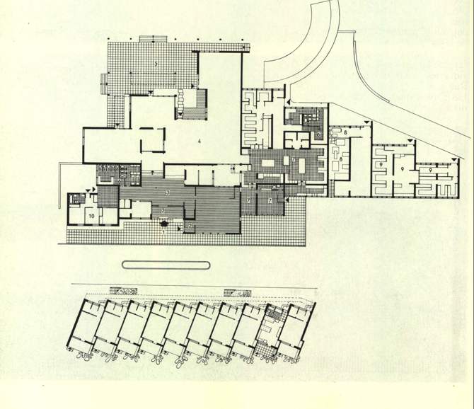 El conjunto de edificios se dispuso de forma que la sensación de horizontalidad fuera la más acusada. Las celosías aplicadas a los huecos de servicios generales y cuartos de baño subrayan esta horizontalidad. El paisaje presentaba escaso interés, siendo tan solo apreciables los alejados fondos montañosos a mediodía y levante, por lo que se crearon vistas inmediatas atractivas en el resto de orientaciones. Se cuidaron las formas de los diferentes cuerpos con el objeto de que, aun respondiendo a un todo homogéneo de gran sencillez, resultara un juego variado de volúmenes. Las comunicaciones peatonales y vehiculares, al igual que las zonas verdes, unifican el complejo y sirven de aglutinante. Todas las habitaciones dan y tienen vistas a las zonas ajardinadas.
