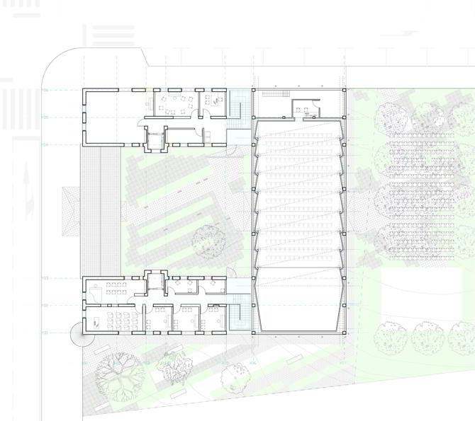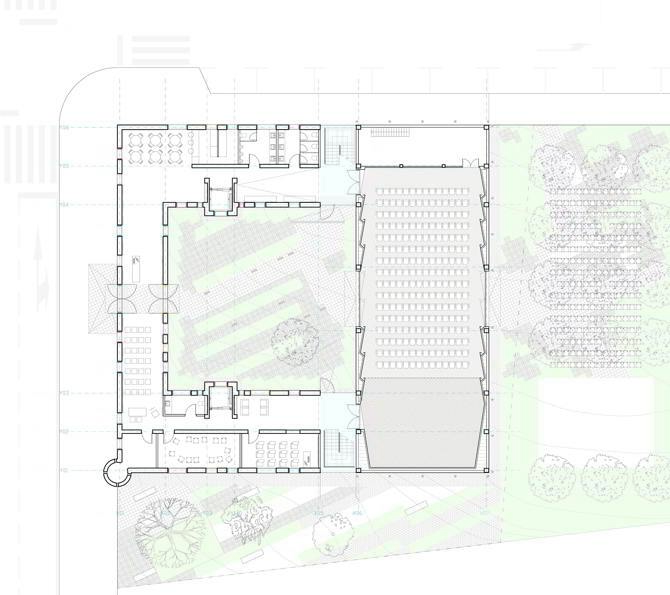 El jardín central se proyecta para ser capaz de albergar un ensayo de la banda de música al aire libre, o cualquier tipo de acto público como una entrega de premios, etc., sin ningún elemento fijo. Además, este se diseña de forma continua con el jardín posterior, en el cual se plantea una zona exactamente igual que el escenario de la sala polivalente capaz de albergar concierto o actos al aire libre. La intervención posee un gran potencial de uso y se propone ‘más por menos’.