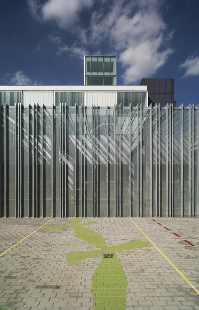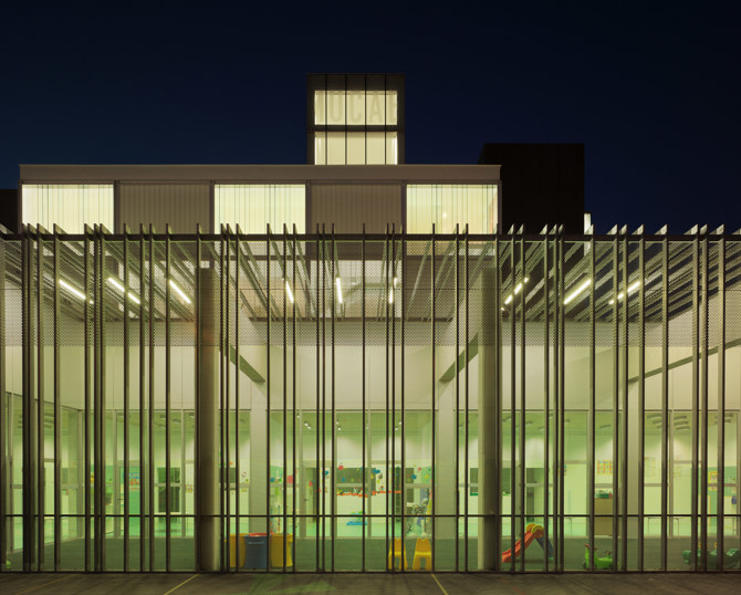 Los diferentes contenidos se desarrollan conforme a una estructura regular, separados por niveles y compartiendo zonas comunes, patios y terrazas abiertas. La guardería se sitúa en planta baja, con una posición privilegiada hacia el río y la urbanización, y disfruta de una doble orientación con patios al sur y al norte. El aparcamiento, situado bajo rasante, es el arranque del edificio y ocupa no solo la proyección del mismo, sino toda el área disponible al sur de la parcela. Los patios superiores perforan su cubierta introduciendo luz natural y permitiendo la ventilación y la conexión visual con el resto de usos del edificio en cotas superiores.