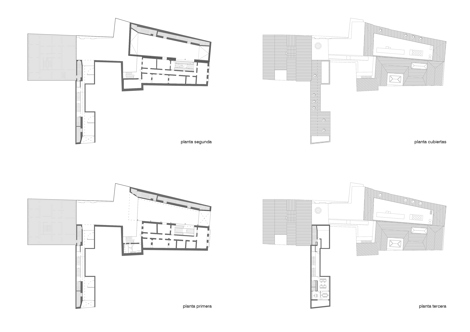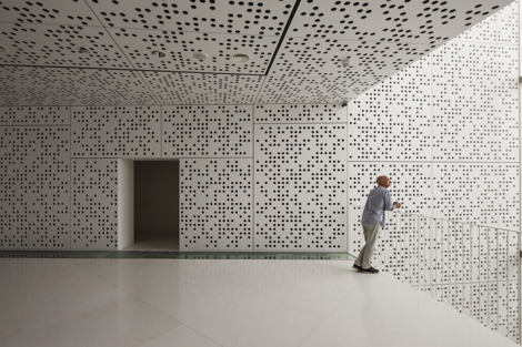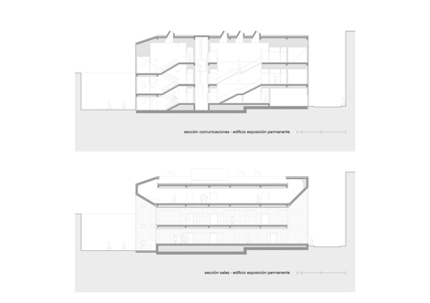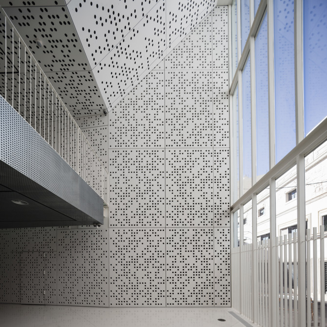 Un esquema tipológico organizado por una “L” invertida responde a los aspectos funcionales, espaciales, estructurales y técnicos. Este esquema se fomenta (en el interior y en el exterior) mediante un revestimiento, un panel de hormigón pretensado perforado, cuya escala y patrón parecen imprimir un mensaje en la piel del edificio. El complejo incluye dos nuevos edificios que se conectan a través de un patio y se abren a dos calles diferentes de la ciudad. Uno de los edificios alberga una colección permanente y está adosado a la construcción original, adaptando los nuevos niveles a los existentes. El otro bloque puede utilizarse para exposiciones temporales y alberga las oficinas de la sede en la cuarta planta. Están conectados por un patio, lo que permite utilizar el complejo de diferentes maneras. En verano es posible organizar conciertos de jazz.