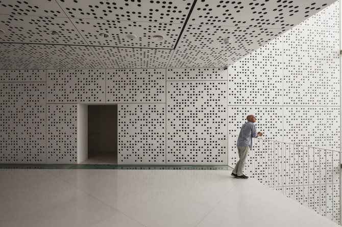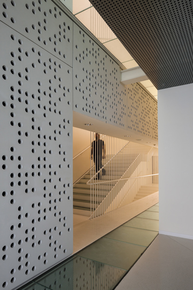 Los grandes paneles de cristal con marcos blancos se colocan descentrados en los marcos metálicos biselados para formar los puntos de entrada a cada uno de los edificios. Detrás de un vestíbulo de doble altura revestido de cristal, una plataforma de metal perforado con delgadas barandillas blancas forma la primera planta del espacio de exposición permanente. En el tercer nivel, el suelo se inclina drásticamente hacia arriba para dar cuenta de la fachada biselada. Las franjas de acristalamiento que atraviesan los suelos blancos brillantes ofrecen vistas a las galerías de abajo y de arriba. Los niveles de las nuevas partes del edificio están conectados por una estrecha escalera blanca, que se llena de luz natural gracias a las claraboyas circulares superiores. En las plantas superiores del espacio de exposición temporal, las ventanas interiores con marcos negros profundos miran desde el nuevo espacio a una escalera en tono terracota con ornamentación metálica.