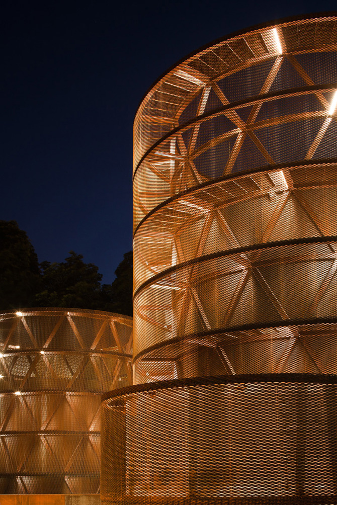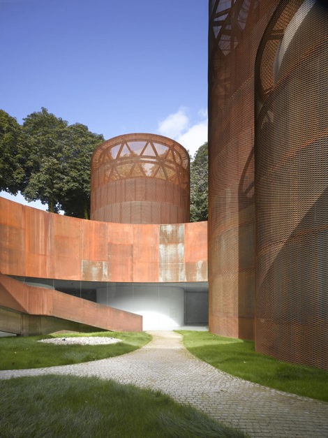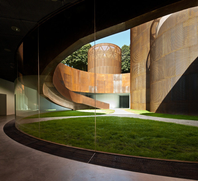 Un gran volumen cilíndrico se hunde profundamente en el terreno generando la sala principal, concebida como una caja escénica. Del patio central emergen como silos abandonados las salas de exposiciones más singulares, que transmiten la imagen del nuevo edificio al exterior. Las torres de exposición están envueltas externamente por mallas de acero corten, ligeras y con iluminación artificial, que se transforman en una instalación visual dentro del paisaje del nuevo parque.