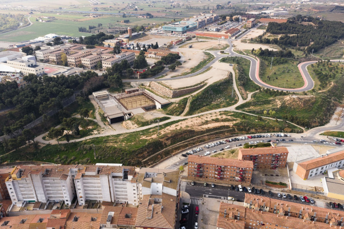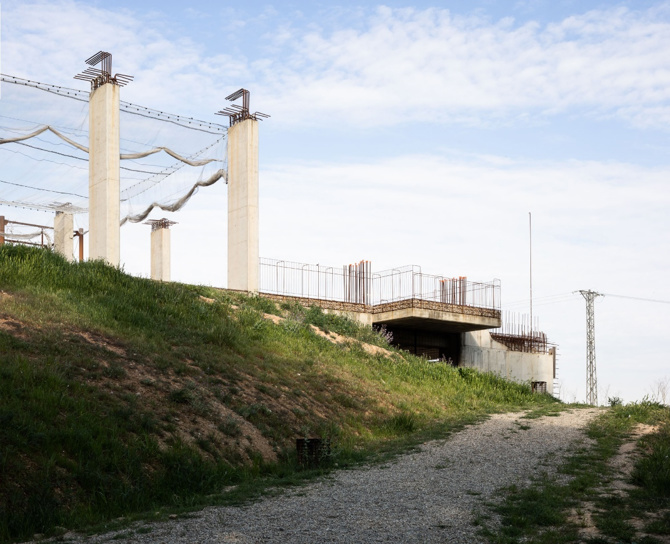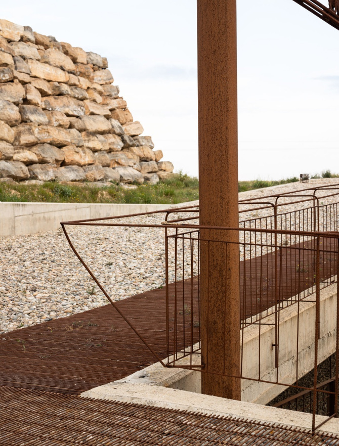 Debido a la crisis económica, la obra prevista inicialmente queda interrumpida al acabar su primera fase entre los años 2010 y 2011. En ella, se movieron cerca de 30.000 m3 de tierras, de los que 25.000 quedaron en el propio lugar para así poder disponer la nueva topografía de las distintas zonas propuestas. Grandes piezas de roca arenisca construyen en seco el acantilado de 9 metros, salvando así el desnivel entre el altiplano y la plataforma del espacio de acogida. Tierra de lutita roja y cantos rodados de río son igualmente el excedente de material reaprovechado, que complementados con arena de sablón y algunas gravas de aportación externa, configuran los nuevos espacios transitables. Una estructura de hormigón inacabad, desciende en espiral del altiplano al bosque..., y una interrupción de cuatro años permite seguir aprendiendo del lugar observando cómo incide en él el paso del tiempo.