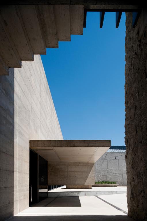De esta manera los tres edificios configuran un patio que se convierte en el vestíbulo del futuro museo y en espacio para actividades polivalentes. Todas las intervenciones se materializan con hormigón basto que se funde con los pavimentos. Una capa de pintura gris protege los muros existentes dejándonos ver su textura (ladrillo, piedra, arcos, cicatrices antiguas de ventanas, etc.) formando un collage contemporáneo de texturas, agujeros y tapiados que es reflejo de los diferentes estratos e intervenciones que ha sufrido el edificio a lo largo del tiempo.