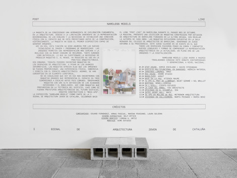 La exposición "Nameless Models" formó parte de la I Bienal de Arquitectura Joven de Cataluña, celebrada bajo el lema "Post Like" en Barcelona durante el pasado mes de octubre. La muestra, presentó una colección de maquetas construidas por estudios de arquitectura de Barcelona fundados en la última década, sin revelar la autoría de cada obra. Las maquetas estuvieron expuestas en la sala mirador del Colegio de Arquitectos de Barcelona, generando un juego entorno a su procedencia. Este juego culminó en un evento en el que todos los despachos pudieron poner en común y compartir nuevos lenguajes y formas de comprender la representación arquitectónica en la actualidad, en plena era de las imágenes y la digitalización.