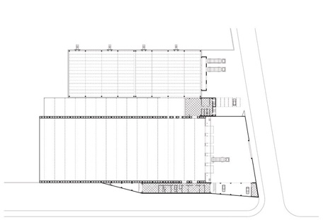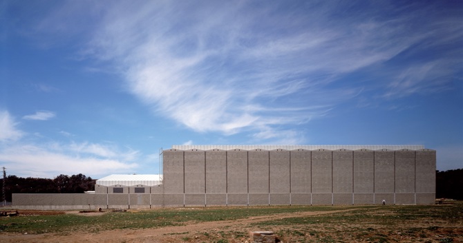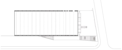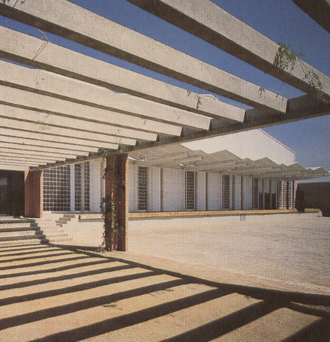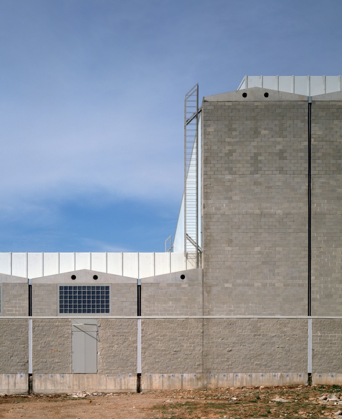 Mediante un ligero cambio de textura de los bloques se diferenció en los muros un zócalo de 3 m de altura que se prolongó hacia la zona de entrada, definió el patio de carga y descarga de camiones, el aparcamiento de coches de los empleados y abrazó también una pequeña construcción dedicada a oficinas y servicios que se situó de manera que no interfiriera en la accesibilidad a la nave.