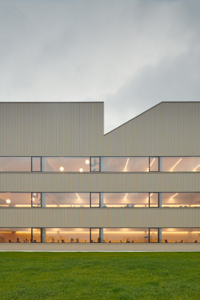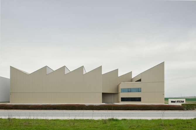 La referida silueta y su inevitable evocación a la sección prototípica de fábrica, tal como evidencian las señales de tráfico o los cuentos infantiles, refuerzan la rotundidad de la imagen. Por otro lado, la tecnológica ligereza que confiere el acero a este contorno quebrado encuentra perfecto acomodo entre las aspiraciones de una empresa ágil, dinámica y agresiva. Además, la reiterada sucesión de faldones, así como su idónea orientación e inclinación, ofrecen el soporte perfecto para las casi obligadas placas solares, que ocupan la mayor parte de la superficie de la cubierta.