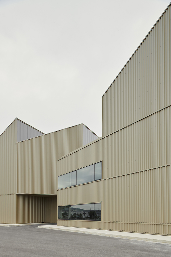 Más allá de la necesaria relación de proximidad entre el almacén o archivo y la zona administrativa, se planteó como premisa evitar la tradicional disociación y procurar un tratamiento homogéneo del único volumen resultante. Además de trasladar una imagen clara e inmediata, esta línea de trabajo permitía aprovechar la importante dimensión de la nave para potenciar la ambiciosa imagen de la fachada administrativa.