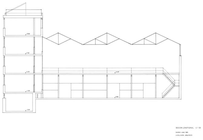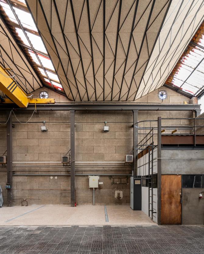 En las naves se utiliza una cubierta en diente de sierra, con una iluminación cenital del espacio, forjados de “viroterm” sobre viguetas metálicas y recubrimiento interior de paredes y cubierta para facilitar la absorción de los ruidos. Destaca, asimismo, el tratamiento singular del revestimiento de ladrillo en fachada, en combinación con la estructura metálica vista.