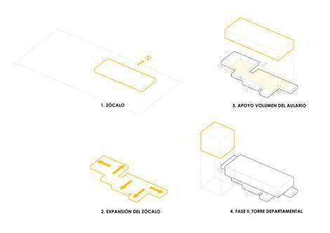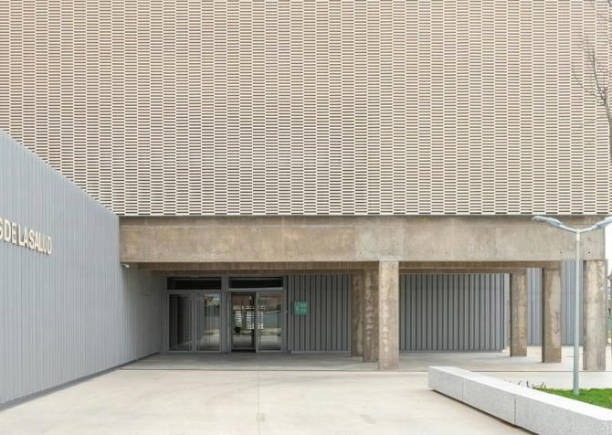 El proyecto se genera a partir de un orden estructural modulado a tres metros, con un prisma de tres niveles que se apoya sobre una planta baja zigzagueante como zócalo. En las plantas superiores se encuentran las aulas de medicina, enfermería y fisioterapia; en la baja los espacios comunes: salón de actos, sala de grados, secretaría, dirección, biblioteca, cafetería, etc. En el volumen superior, las aulas teóricas se orientan a norte y las aulas prácticas -más pequeñas- de enfermería y fisioterapia, a sur. El zócalo singulariza su perímetro mediante cuerpos que salen respecto del volumen superior (como el salón de actos, la cafetería o la biblioteca), o vacíos que entran para generar los zaguanes de acceso.