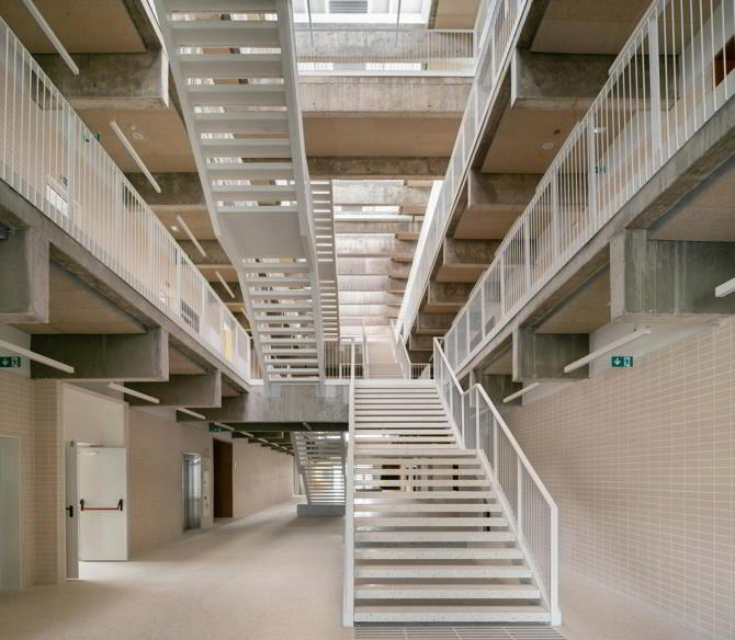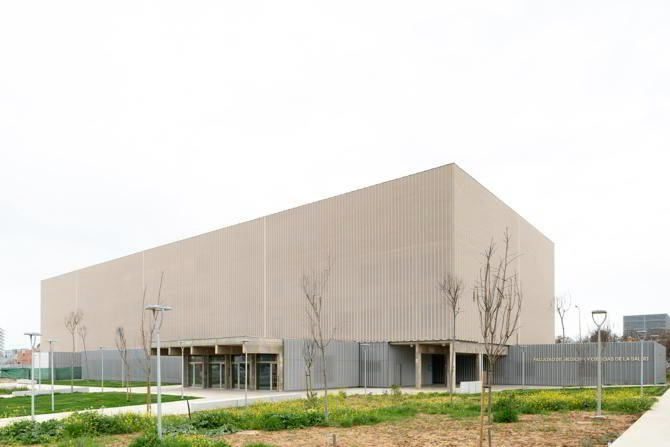 La elementalidad geométrica exterior se transforma interiormente en un espacio sorpresa, de ochenta metros de largo y hasta diecinueve metros de alto, iluminado desde arriba y concebido como un pulmón, espacio de descompresión y relación de la facultad. Un vestíbulo como gran vacío de comunicación e intercambio con los accesos a las aulas, sitios de descanso y otros lugares repartidos en diversas plantas que, gracias a su amplitud, se convertirán en espacio de trabajo informal con la instalación de algunos grupos de mesas.