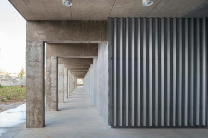 La materialidad interior está determinada por la estructura de hormigón, paredes de ladrillo blanco con embocaduras de madera de cerezo en los accesos a aulas y policarbonato como cierre de los espacios comunes. En el exterior, el zócalo es una doble piel con acabado de chapa plegada y perforada, mientras, arriba, una celosía de ladrillo protege las fachadas orientadas a este, sur y oeste de la radiación directa del sol. Sus grandes dimensiones llevaban a la necesidad de buscar un sistema industrializado para la misma. El sistema IRIS de Malpesa daba solución al problema del plazo dado su montaje en seco y su rápida ejecución. La fachada norte, a la que vierten las aulas mayores, necesitaba grandes ventanas en busca de luz natural, pero no protección pasiva de la radiación; construida con ladrillo blanco, se muestra como un plano horadado y regular de ventanas a partir del orden generado por la estructura de pilares y vigas de hormigón.