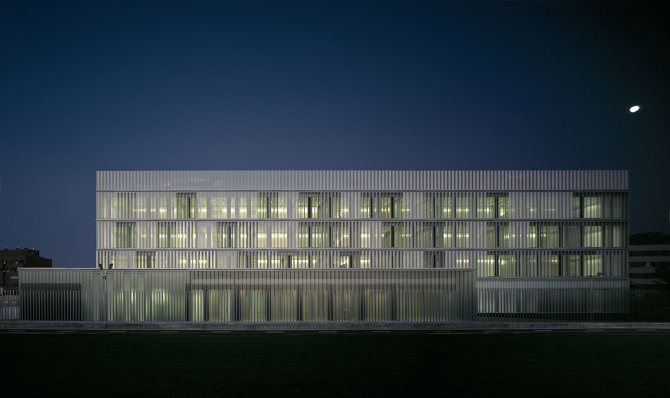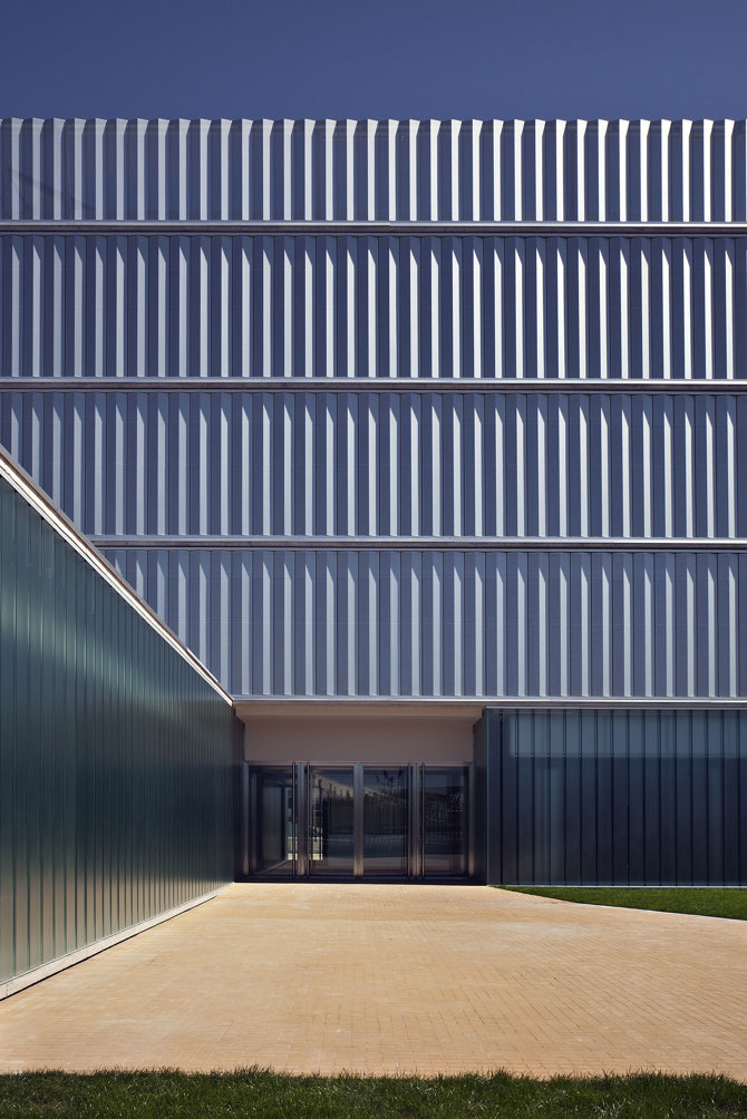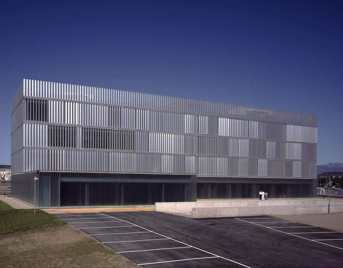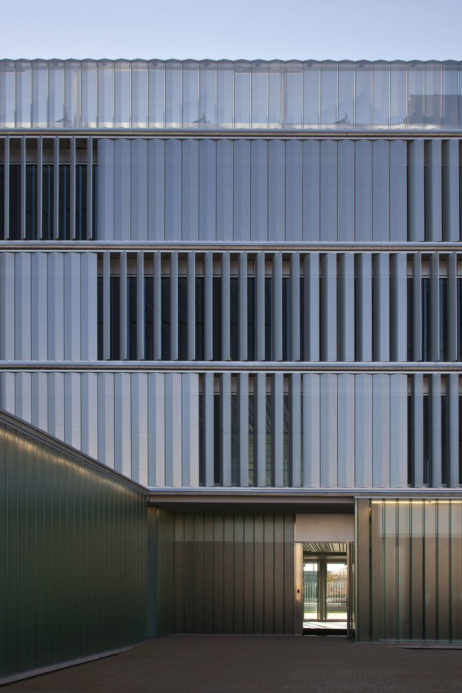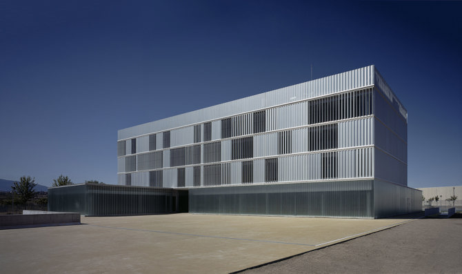 La envolvente exterior se materializa con una doble piel: en la pastilla superior, fachadas este y oeste, un primer filtro exterior de lamas móviles de chapa de aluminio perforada y sección triangular protegerá de soleamiento la hoja interior de vidrio; en el basamento, la piel exterior se configura mediante lamas verticales de vidrio doble u-glass para permitir el paso de la luz y proteger de las vistas. Dos patios en planta baja facilitan un interior luminoso e integrar un programa doméstico, como la vivienda del comisario, en un edificio de carácter eminentemente público.