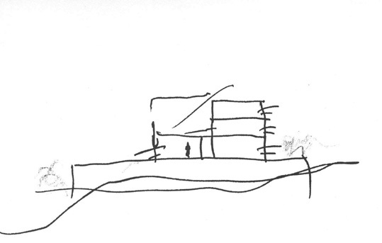 Su situación en primera línea frente a la carretera y paralela a ella lleva a un esquema lineal que por otra parte da una muy buena respuesta a la función de unas oficinas que además puede tener futuras ampliaciones. El edificio adapta sus fachadas, con diferentes tipos de huecos, para atrapar la luz necesaria. A oeste abre un gran ojo que enmarca el bellísimo paisaje de la sierra madrileña.