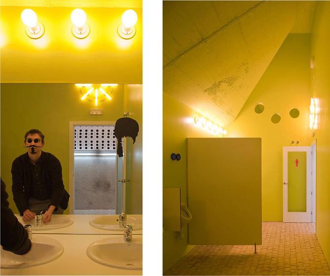 Siguiendo y reflejando otras estrategias de reutilización desplegadas a lo largo del edificio (puertas de lavadoras como ventanas, restos de fieltro como muebles, taladros de cilindro como asientos de tambor), las antenas parabólicas se han reconvertido en lámparas de alto rendimiento y bajo presupuesto, formando una especie de nube tecnológica sobre los vestíbulos.