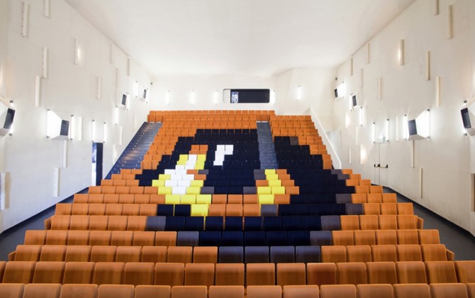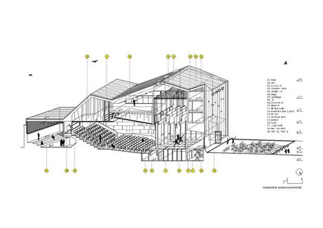 Pero más allá de una mera afección funcional o contemplativa, el edificio desafía el tradicional papel del espectador como ingrediente pasivo, invitándole a alcanzar cierto grado de complicidad tanto con los visitantes como con los transeúntes, de modo que pueda involucrarse incluso cuando no tiene lugar una representación. Varios dispositivos arquitectónicos ayudan en esta tarea. Por ejemplo, el escenario (además de ofrecer una posición que favorece la carga y descarga directa) puede abrirse literalmente a la ciudad y a sus ciudadanos, mientras que los asientos de la orquesta son píxeles de colores que, vistos desde el escenario cuando está vacío, componen la anamorfosis de un ojo que mira siempre rodeado por las paredes naturales de fieltro de este espacio.