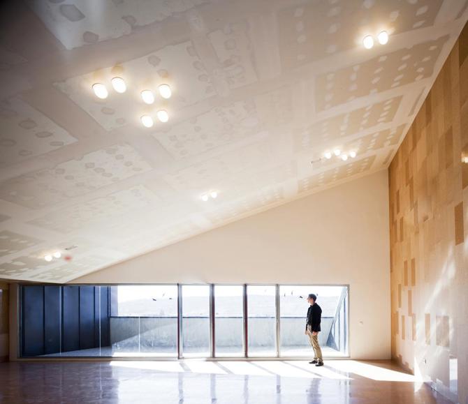 La irregularidad de la parcela desencadenó una estrategia de ocupación del solar al extender el programa funcional para crear una nueva envolvente con una escala cercana a la de los edificios existentes, absorbiendo la geometría desordenada y ofreciendo una imagen representativa. El volumen principal (que contiene la orquesta, el escenario, las salas principales y una sala de ensayos) emerge ampliando el paisaje formado por las cubiertas de teja árabe. El diseño aborda la deseable adecuación técnica y versatilidad de este tipo de instalaciones en una ciudad pequeña (cine, teatro, sala de conciertos...).