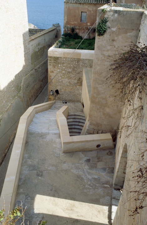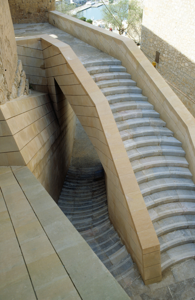 Ahora el castillo tiene una puerta abierta en la plaza más antigua de la ciudad. Sus muros se han revestido con sillares de piedra arenisca –marés– igual a la de los lienzos del recinto medieval. El rápido envejecimiento de la piedra difumina la nueva construcción con la antigua. La escalera es de ida y vuelta, y en el techo del primer tramo aparece, incrustada en latón, la planta que en 1544 dibujara Giovanni Battista Calvi de la fortaleza árabe de la ciudad, antes de que proyectara la renacentista.