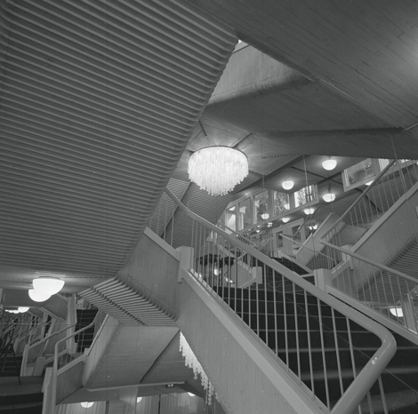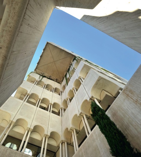 Entre los arcos y el forjado superior se sitúan los conductos de aire acondicionado, que permiten un techo monolítico de hormigón con aspecto de estuco mediante bañeras tradicionales, casetones satinados sin aristas, que alojan la iluminación cenital practicable desde el suelo.