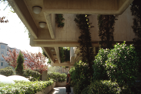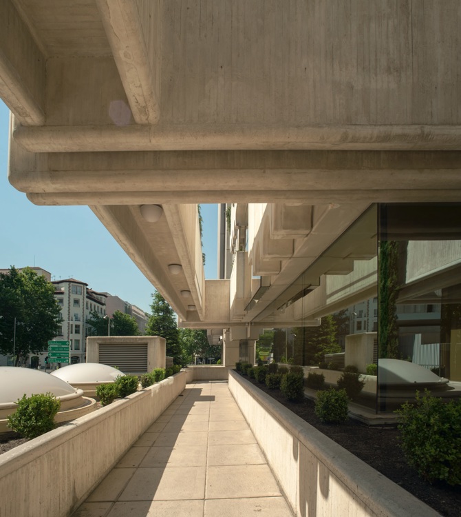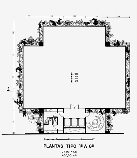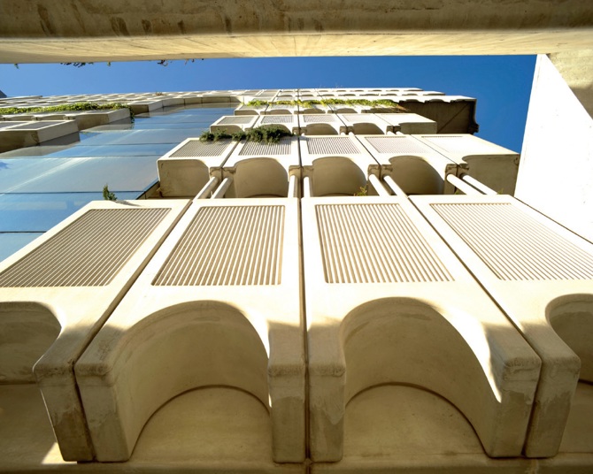 Fachada de hormigón visto blanco prefabricado con jardineras incorporadas. Esta solución carece de pilares interiores, huyendo del muro cortina que llegó a España con tanto retraso. Las piezas prefabricadas de hormigón se sustentan por gravedad, sentadas sobre el borde de forjados. Cada una contiene una jardinera con gran capacidad de tierra bajo la que van conductos perimetrales de instalaciones.
