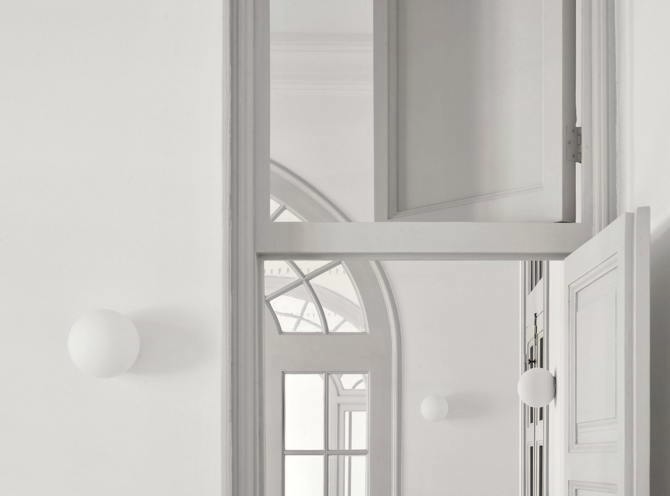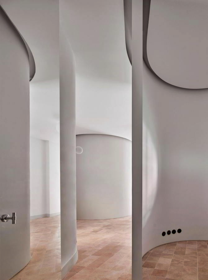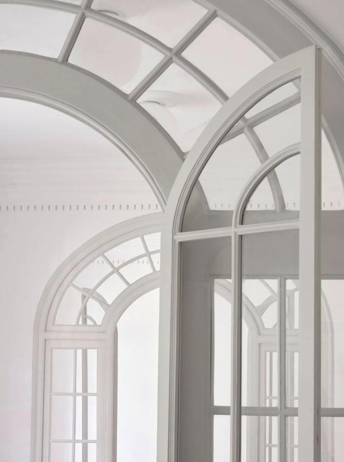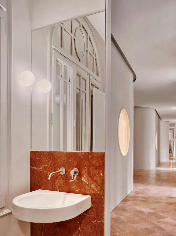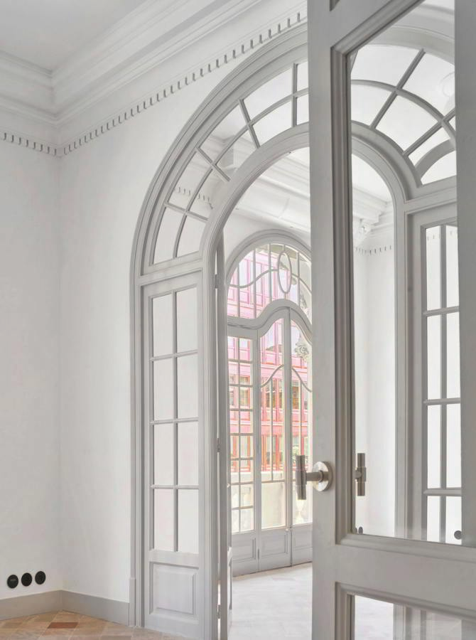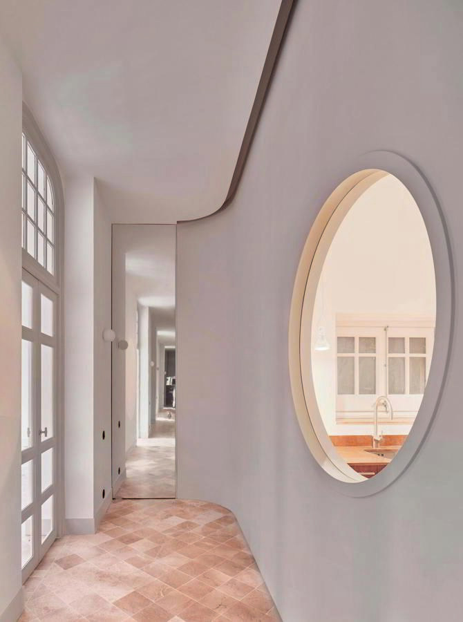 La transformación busca resaltar el carácter noble de las salas principales, que están conectadas a través de puertas de cristal, manteniendo la ambientación noucentista. Por otro lado, se ha introducido un nuevo sistema de acceso y distribución para organizar una funcionalidad más fluida y crear nuevas perspectivas entrecruzadas. Esto se logra a través de geometrías curvas inspiradas en el atrio ovalado del edificio. Al final de cada curva, se han incorporado altas puertas espejadas para expandir la percepción aséptica de esta área. Esto contrasta con las salas noucentistas de la fachada y sirve como una transición del atrio a las salas de la facha- da. Ahora, todas las habitaciones tienen acceso independiente desde este pasillo, mejorando la flexibilidad y adaptabilidad del piso.