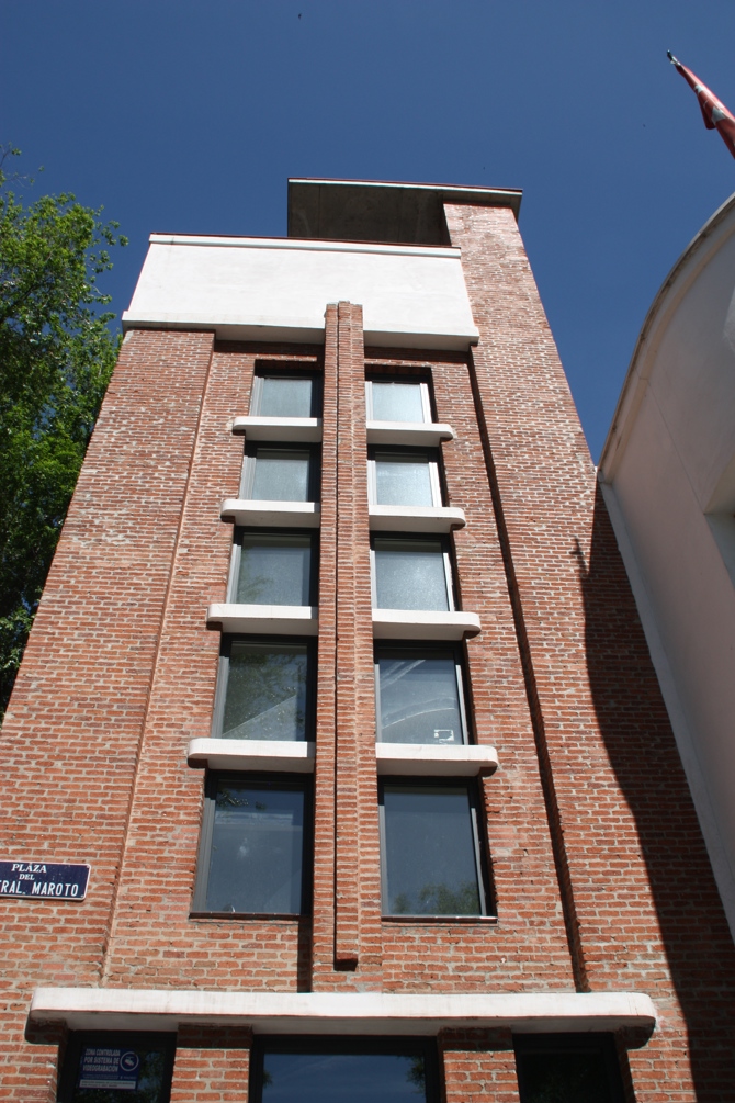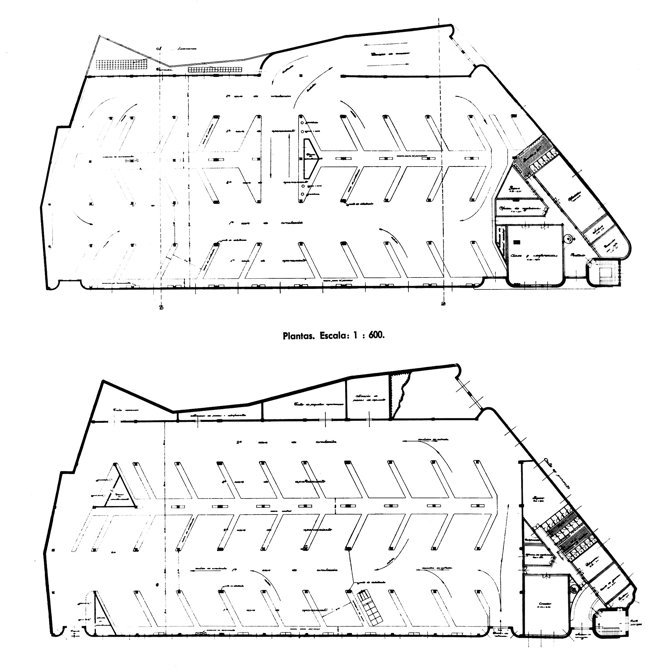 Aprovechando la irregularidad de la parcela el edificio se articula en dos zonas: garajes sobre la más regular y oficinas en el ángulo más agudo del solar, el formado por el viario. Se levantan dos plantas unidas por una rampa que permite el acceso de camiones. El garaje está formado por una nave de 78 X 40 m, con soportes de hormigón cada 8 m y cubierta metálica en dientes de sierra. Sin duda constituye uno de los mejores ejemplos del racionalismo madrileño, con buen sentido en el manejo de la luz interior mediante los dientes de sierra y el lucernario central. El chaflán se articula con un bello torreón donde se inserta la escalera.