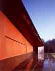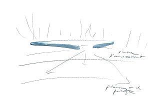 El dintel-cubierta se suspende sobre dos elementos que se abren y cierran para acoger unos servicios, un bar, un almacén y un punto de información. Dos materiales, madera y acero, cubiertos de óxido y negro como masas de escoria tendidos sobre un suelo pétreo, casi basáltico.