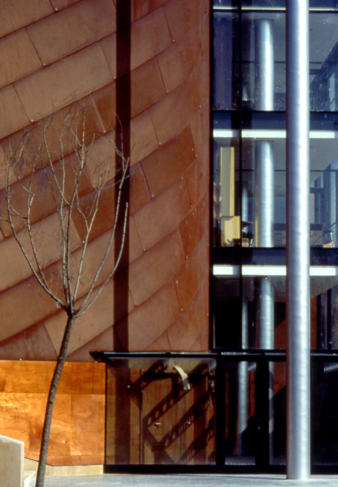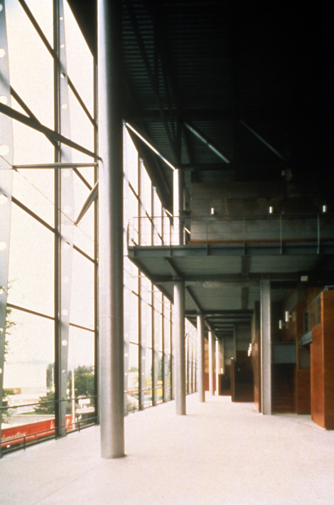 Los elementos constructivos son igualmente utilizados para proporcionar tensión al edificio: el vidrio de los grandes muros cortina desarrollados con la tecnología de acero o las grandes celosías de cubierta se oponen, dialogando con ellos, a la piedra del zócalo exterior y del pavimento del vestíbulo.