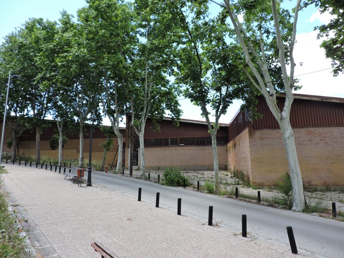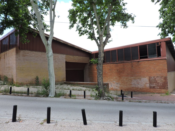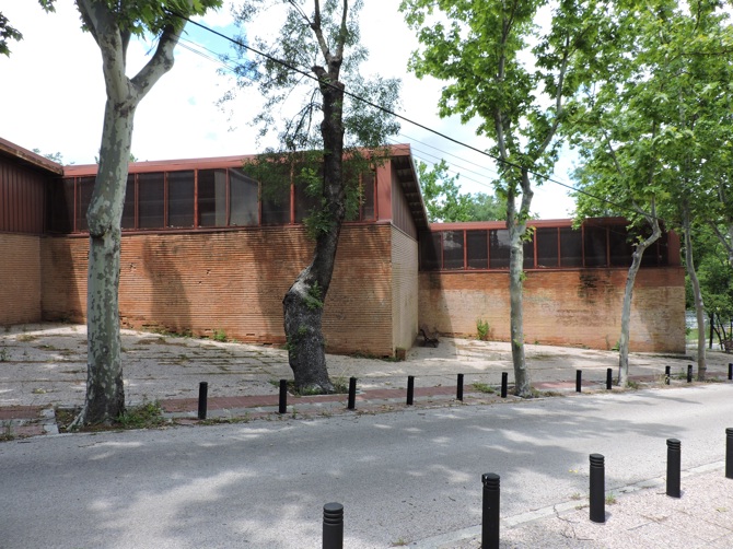 Inicialmente el pabellón debía de usarse únicamente durante las ferias, en primavera, y es por ello que no se planteó un cerramiento completo. Así, la gran cubierta inclinada que desciende en paralelo al terreno volaba por encima de los muros de ladrillo, sostenida por los esbeltos pilares metálicos, y permitía el paso de corrientes de aire para refrescar el interior. Con un hábil zigzagueo el cerramiento se adapta al contorno de un solar complicado y acompaña el descenso de la calle del Arroz, reduciendo de esta manera la escala del edificio, que se percibe como un todo exclusivamente desde la distancia. Cabrero utiliza, como es habitual a lo largo de su carrera, una paleta de materiales voluntariamente restrictiva. En este caso, el hormigón se emplea para los muros de contención y las bancadas. Por encima los pilares metálicos y la cubierta de fibrocemento conforman una cubrición etérea, y el ladrillo, por último, aporta una imagen cálida a pie de calle.