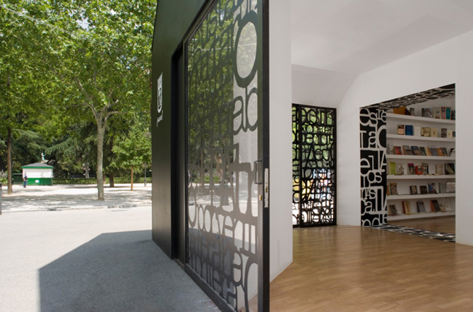 El programa se introduce en tres espacios diferenciados, como cajas que responden cada una a una parte del mismo, una entrada, una zona de venta de libros y una sala multiusos. Nos gustaba pensar en la imagen cambiante del interior cuando el sol entrara a través de las ventanas y los lucernarios. La solución de las celosías de letras fue muy interesante ya que nos permitió cubrir todos los huecos con distintos versos de poetas madrileños. Fue una solución “muy literaria” para un edificio en la Feria del Libro.