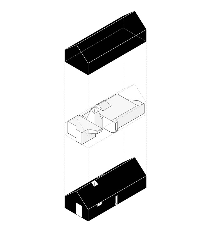Desde el principio planteamos para el pabellón dos objetos independientes, dos arquitecturas, una dentro de la otra. Queríamos que el pabellón se contara desde dentro, como los libros. La carcasa exterior se construye a partir de una figura geométrica singular conocida. Una sencilla nave a dos aguas recubierta de paneles de madera, pintada e impermeabilizada de un color negro intenso, que ofrece una imagen compacta y cerrada. El interior es un contrapunto al exterior con una geometría más compleja, amplia y luminosa y pintada de blanco, que arroja numerosas vistas sobre el parque.