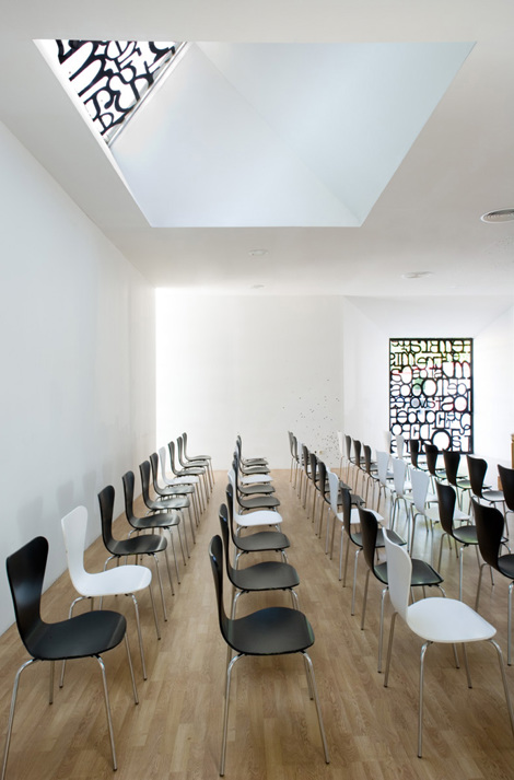 Queríamos construir un edificio en el que no fuéramos capaces de leer desde el fuera lo que estuviera pasando dentro, que fuera capaz de sorprendernos al entrar. Sobre la misma carcasa exterior se desarrollan distintas secciones en el interior, que responden, por un lado, al programa y, por otro, a una calibrada relación del edificio con el parque del Retiro a través de distintos huecos que conforman los accesos, las ventanas y los lucernarios.