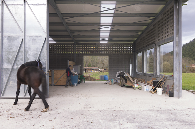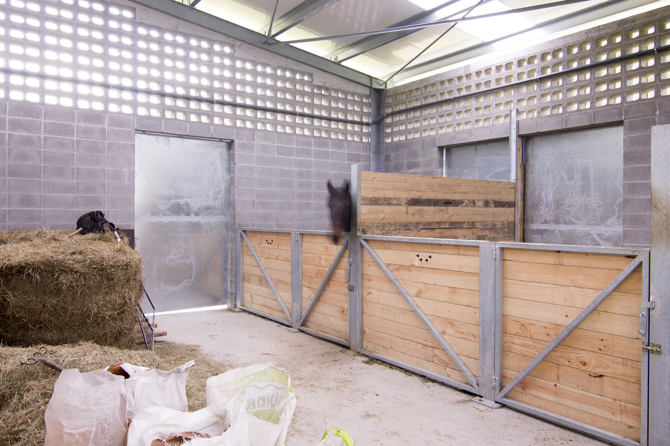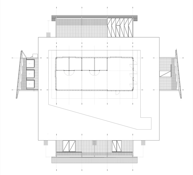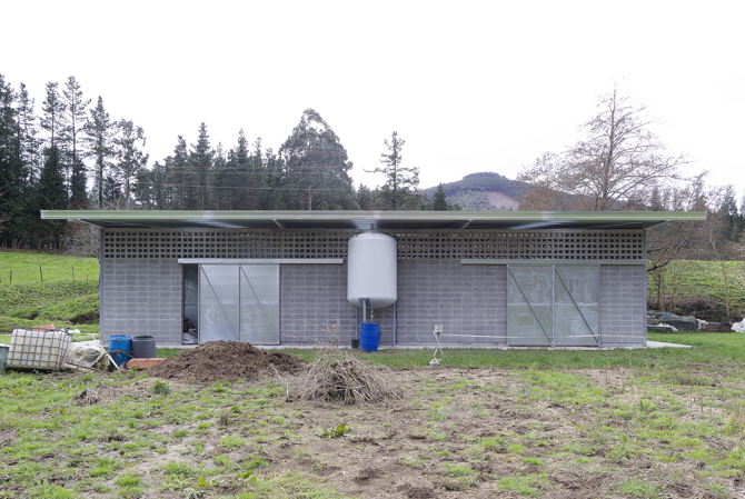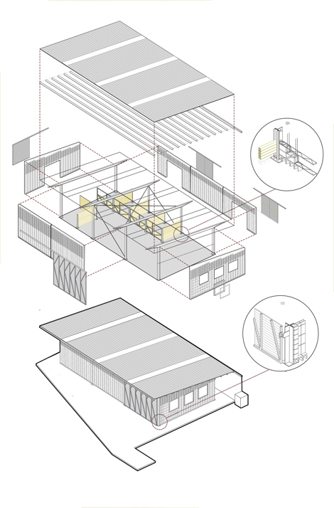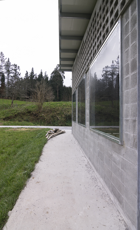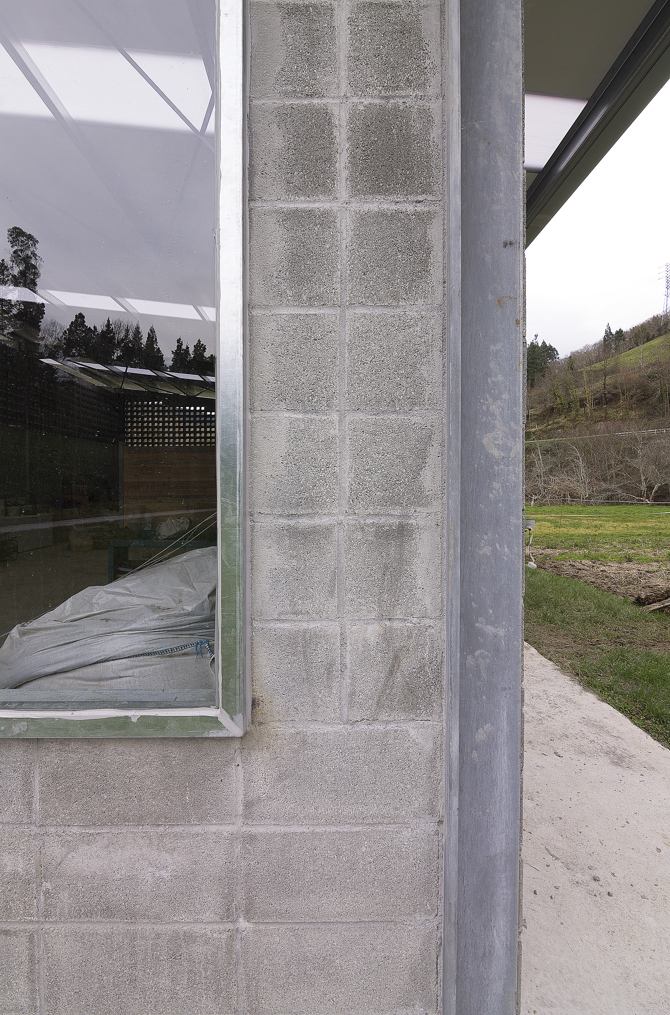 La estructura portante, las puertas correderas de acero galvanizado y las particiones interiores están moduladas según el tamaño del bloque de hormigón, generando una limpieza constructiva y una coordinción dimensional en todo el edificio