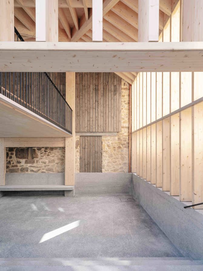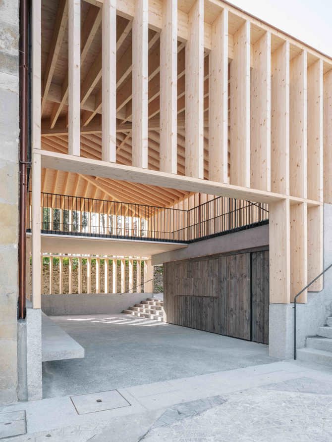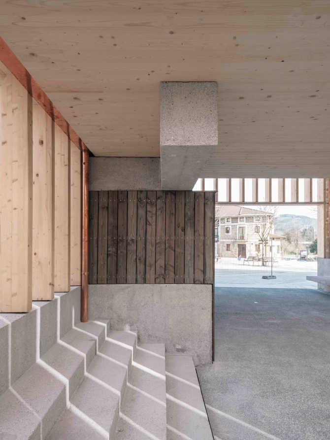 El nuevo espacio público cubierto se configura mediante una estructura que hace las veces de envolvente de la nueva volumetría, muy parecida a la del edificio existente con anterioridad. Desde una perspectiva similar de respeto por la preexistencia, se plantea la recuperación de la fisionomía original de la medianera de la casa consistorial en planta baja, así como la integración de las escaleras exteriores y su fuente anexa en el nuevo edificio, de forma que mediante su identificación en la memoria colectiva de los larrabetzuarras, estas contribuyan a la asimilación e integración tranquila de la nueva edificación, tanto físicamente en el cuidado y protegido entorno del casco histórico, como temporalmente como un sustrato más en la historia del lugar.