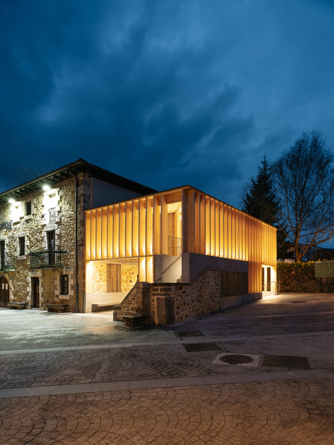 En cuanto a la imagen de la edificación esta ofrece una imagen contemporánea, pero a su vez respetuosa con la tradición arquitectónica local tanto en su forma y volumetría concordante con la edificación existente anteriormente, como en sus materiales de construcción y acabado. Los materiales escogidos, madera y piedra, y hormigón tratado de aspecto pétreo, contribuyen a la correcta integración en su entorno. Además, la intervención de sustitución del edificio existente por otro claramente diferenciado del edificio principal, el edificio del Ayuntamiento, y la recuperación de la medianera como nueva fachada, contribuye a realzar el valor compositivo del conjunto, poniendo en valor la casa consistorial, e integrándose así la nueva edificación, a pesar de su apariencia contemporánea, de forma mucho más armoniosa y silenciosa en el ámbito de la herriko plaza de Larrabetzu.